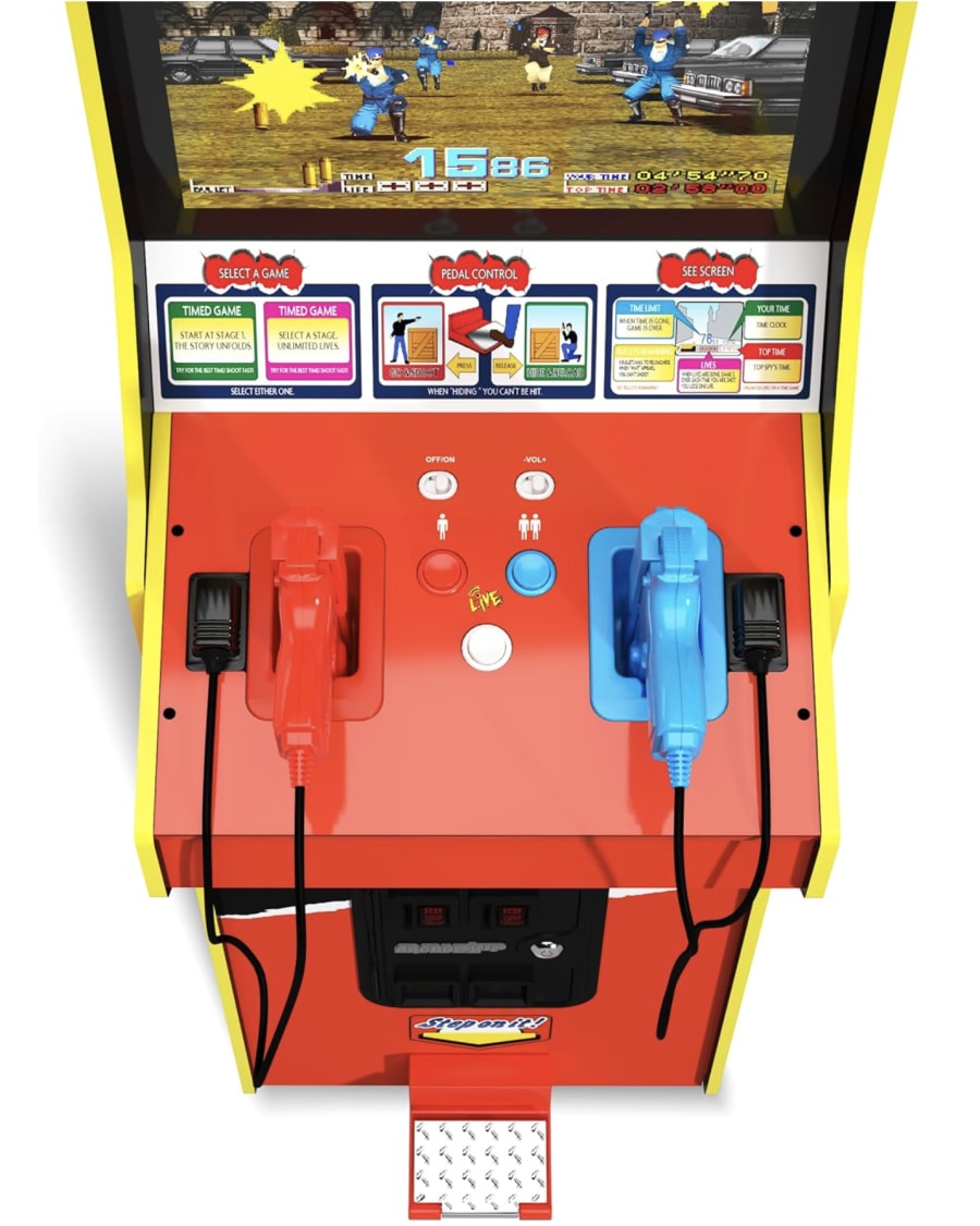 - 🔫 Authentic Controls: Features two guns with mechanical slide action and a single-action foot pedal (for TIME CRISIS), delivering an authentic arcade feel.