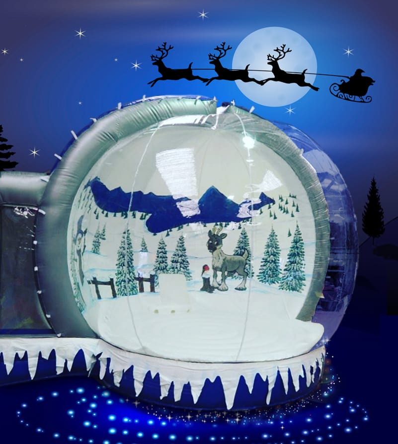 Giant Snow Globe for hire in Edinburgh Tis the season to be jolly in this unique festive inflatable, Come with staff Bounce into Christmas It’s the time of year when children are jumping up and down with excitement and anticipation. So this year, give them a boost while they do with this amazing giant snow globe for hire in Edinburgh and the surrounding towns. It’s just like those snow globes you have on the shelf, only this one is big enough to climb inside to make some truly magical Christmas memories. The centre of attraction Forget boring decorations that people can only look at; this is the ultimate festive bauble that you can fully interact with. With a big, soft bouncy castle floor, the kids can burn off all that excess energy and tire themselves out no matter how many more sleeps ‘til Christmas. It’s amazing memorable fun and an ideal photo opportunity, with a classic Christmas snow scene across the back and a clear top-to-bottom panel at the front so everyone can share the fun. Let it snow, let it snow Hire a giant snow globe in Edinburgh and you are sure to draw the crowds to watch the kids having fun and to have a go themselves. It looks great as the centre piece of shopping centre Christmas decorations, and it’s a top performing attraction at any festive fair or Christmas market, whether you’re running it for profit or for charity. Add one to your company children’s Christmas party and you can thank them for letting you borrow mum or dad so much for the last year. It’s Christmas time We’ve got lots more inflatable fun for hire this Christmas, so check out our full festive range. You’ll find everything from fully lit inflatable Christmas trees, to a sensational Santa’s grotto. We’ve got disco bouncy castles for your Christmas party, frozen cocktails for your older guests, and we can even help run your event with professional event staff for hire in Edinburgh. Talk to our team of elves for the best Edinburgh Christmas hire ideas. Book now It is never too early to book your Edinburgh Christmas hire, because people start reserving the best dates earlier and earlier every year. Click below to book now before someone beats you to it.